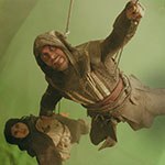 Можете ли Вы подробно рассказать о работе над этой Последовательностью?Паркур Марии (действие 1): в этом действии Мария, оттолкнувшись, прыгает с передней части повозки на заднюю, чтобы бороться с тамплиером. Эти кадры состояли из фоновых планов, снятых в Испании с повозкой вживую и каменной стеной, а так же планы с зеленым фоном, где Мария на тросах делает свой прыжок. Для того, чтобы собрать все воедино должным образом, мы взяли заранее отснятую повозку на заднем фоне и Марию -- на зеленом фоне. Это позволило нам объединить кадры, зная наверняка масштаб актрисы. Позже мы добавили искусственную пыль и мусор.