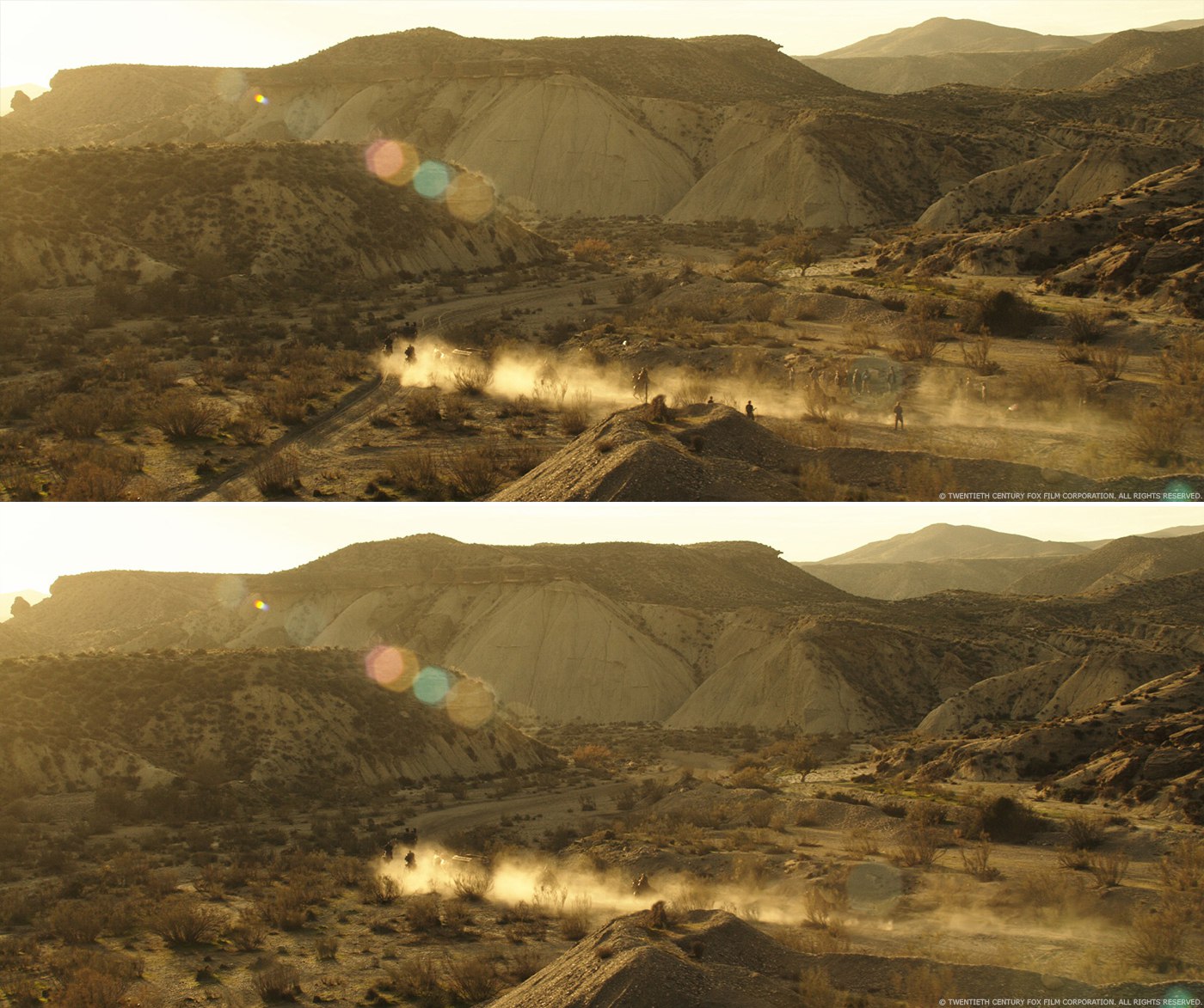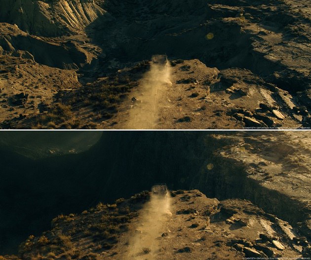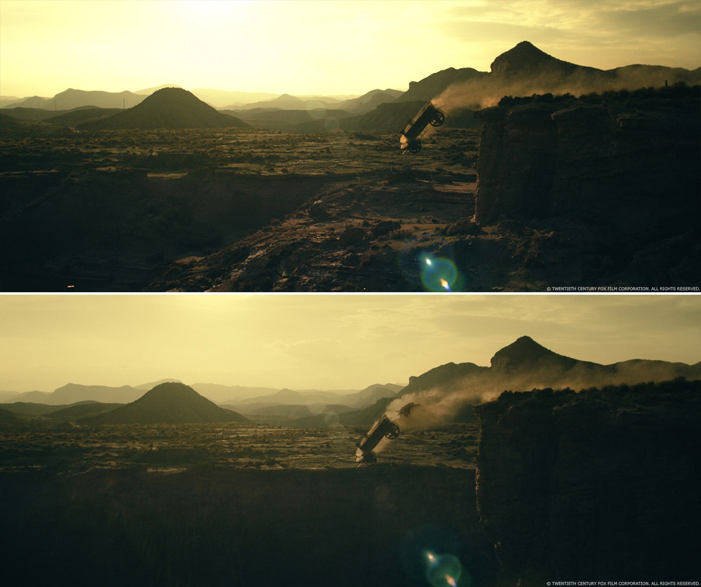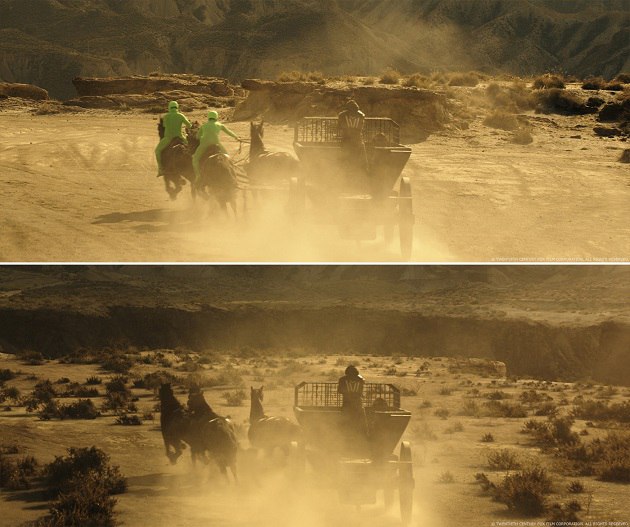 Прыжки Агилара (действие 2): Агилар прыгает со своей лошади на крышу повозки Охеды. Наши люди снимали несколько ракурсов для каждого эпизода (повозка движется на большой скорости, дублёр Агилара на своей лошади скачет на большой скорости, актёр-каскадёр прыгает с лошади и пр.). Мы действовали по той же схеме, что и паркур Марии. Мы заранее отсняли повозку, Агилара и его лошадь. Затем мы склеили всё вместе, чтобы получить полноценный масштаб. Мы должны были обмануть скорость, с которой бежит лошадь, потому что в противном случае она бы почувствовала, что Агилар прыгает быстрее, чем движется сама повозка. В сцене не обошлось без добавления FX-пыли. Так же было заменено лицо дублёра Охеды.