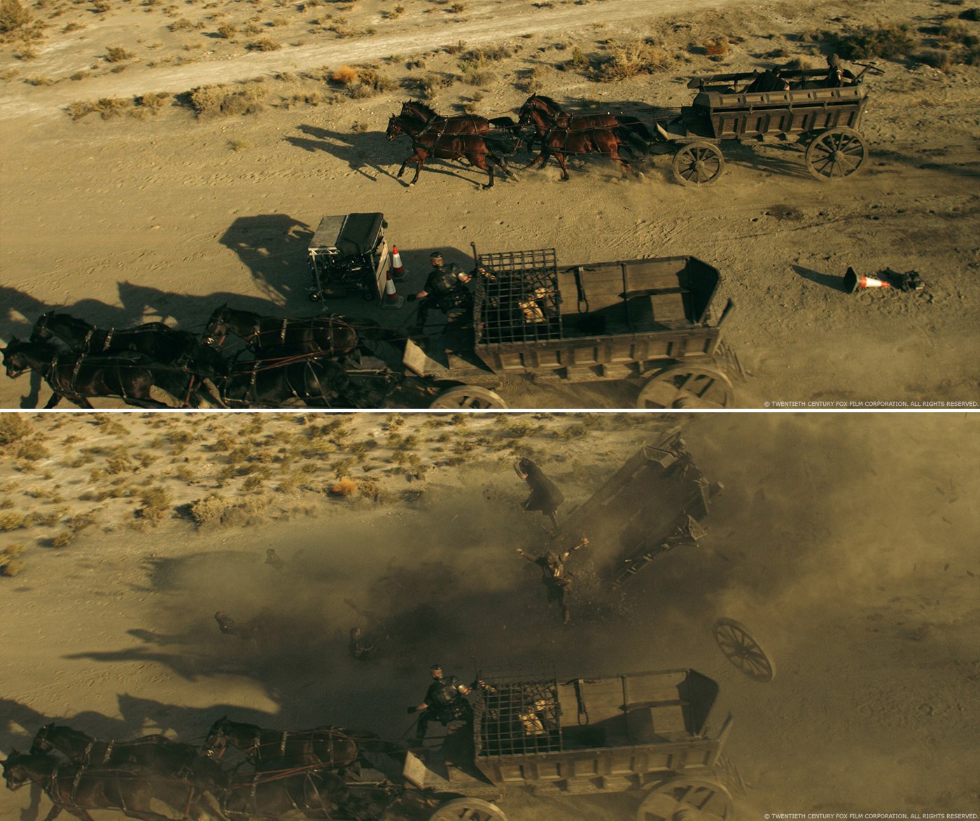 Разрушение повозки (действие 3): это было безусловно самой сложной частью Последовательности. Наши люди снимали еще раз несколько разных ракурсов (переворачивание повозки, лошади, повозка с клеткой, Охеда и Агилар). К сожалению, повозка не переворачивалась так, как Джастин хотел. Ранее мы предложили сделать полный CG, чтобы мы сами могли контролировать его анимацию и количество разрушений на всех сценах. Гед и Джастин согласились с нами пойти таким путем. После того, как CG-анимация повозки была утверждена, мы продолжили делать FX-моделирование, чтобы разбить его на части. По ходу сцены мы также заменили все повозки и лошадей на CG. Из-за соображений безопасности они были сняты отдельно. Они никак не реагировали на воздействие повозки. Лошади были вручную проанимированы и добавлены дополнительные FX-элементы для них. Охеда и Агилар были сняты вживую в некоторых сценах, а также сделаны полностью из CG в других. Наша команда композитинга создала бесшовные кадры из многих слоев 2D и 3D.