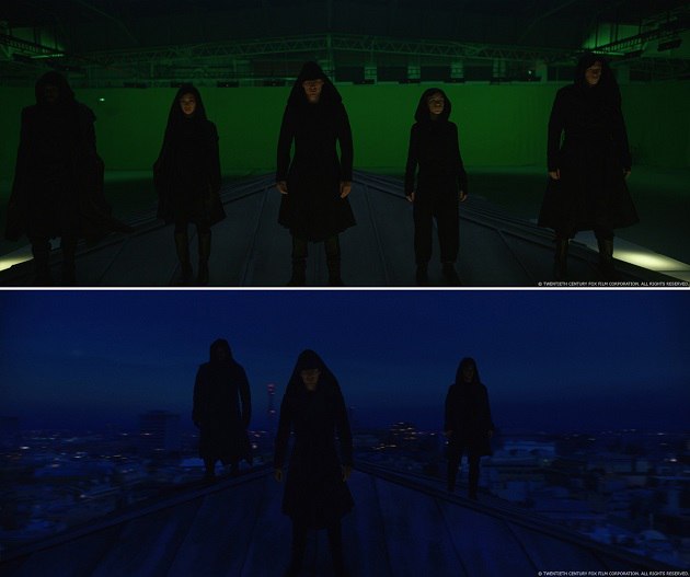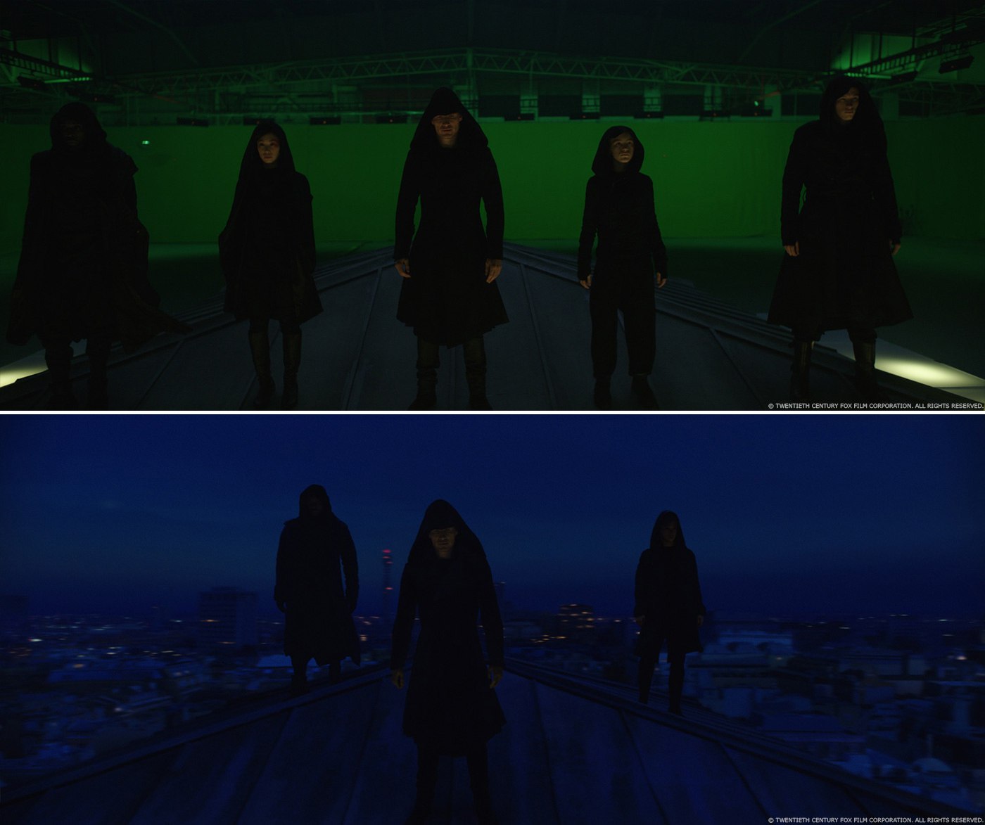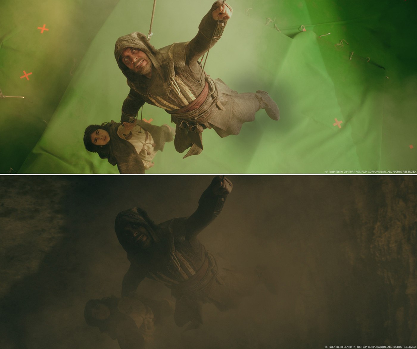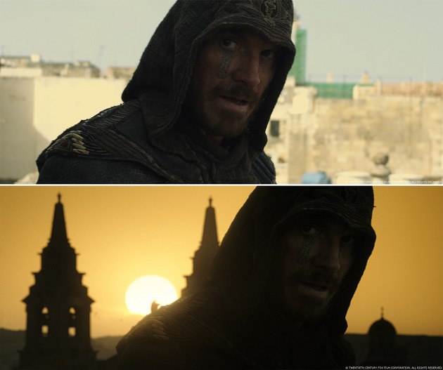 Proof. Используя черновики как ориентиры, команда отсняла два отрезка. Первый был снят на месте у входа во Freemasons Hall в Лондоне – камера тянется вверх и удаляется от Марион Котийяр, пока она находится в здании. Второй отрезок был отснят на зелёном экране студии в Лос-Анджелесе, где была сооружена часть той крыши, на которой стояли Кэл и другие ассасины. Камера приближается к актёрам со спины и вращается вокруг них на 360 градусов. Как только у нас совпали оба отрезка, мы соединили их вместе по порядку, чтобы создать единое непрерывное движение камеры. К сожалению, из-за ограничений, вызванных отрезком с живыми актёрами, мы быстро поняли, что этот подход не сработает, движение камеры не чувствовалось реалистичным. Чтобы достичь того, чего Джастин хотел за оставшееся время, мы решили объединиться с Raynault VFX, убрать зелёный экран и полностью перейти к CG, как только камера отдаляется от Марион Котийяр. Конечно, это значило, что необходимо создать цифровых двойников трёх ассасинов. Для их лиц мы снова спроецировали кадры живого действия.