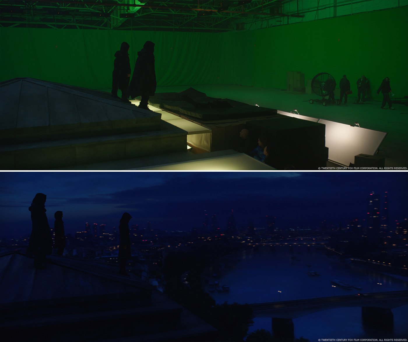 Как вы создали это ночное окружение Лондона?Когда мы изначально ставили на большой кадр, облетающий Лондон, ещё в январе, мы уже знали: частично пейзаж будет в CG. Однако из-за строгих полётных ограничений в Лондоне и движения камеры, в конечном итоге мы воссоздали для кадра в цифровом виде весь пейзаж (всё окружение). Для того, чтобы добиться этого, команда отсняла для нас текстурное фото в высоком разрешении (Alexa 65) с вертолёта, в пятистах футах над Лондоном. Перед тем, как отснять кадр, мы тесно работали с Гедом, чтобы спланировать маршрут вертолёта и решить, какие линзы использовать. Для нас было важно получить чёткие кадры для воспроизведения.
